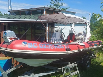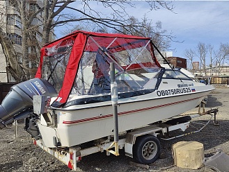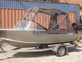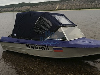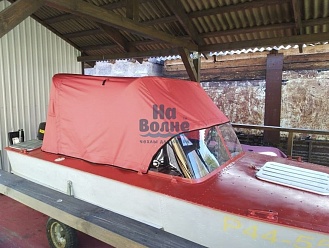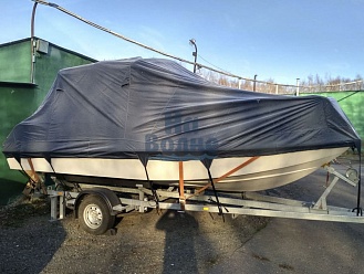 Тент с задней дверью для выхода к мотору, небольшими боковыми окнами и усиленными краями для установки застёжек. Изготовлен из специализированной тентовой ткани Оксфорд 600 повышенной плотности
